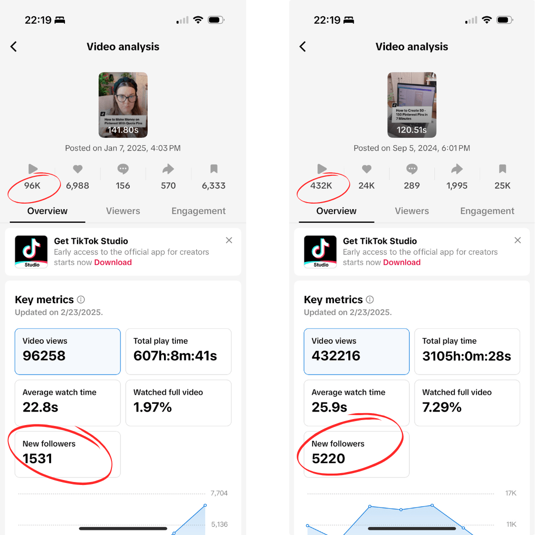 I shifted my focus to Pinterest and TikTok, built my strategy around keywords and searchable content, and within four months I had:
