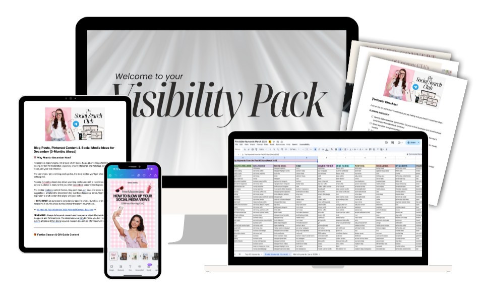The Social Search Club is your affordable monthly membership helping you to get found in organic searches on Pinterest, TikTok & Google, grow your visibility, and create content that leads to clicks, clients and cash.